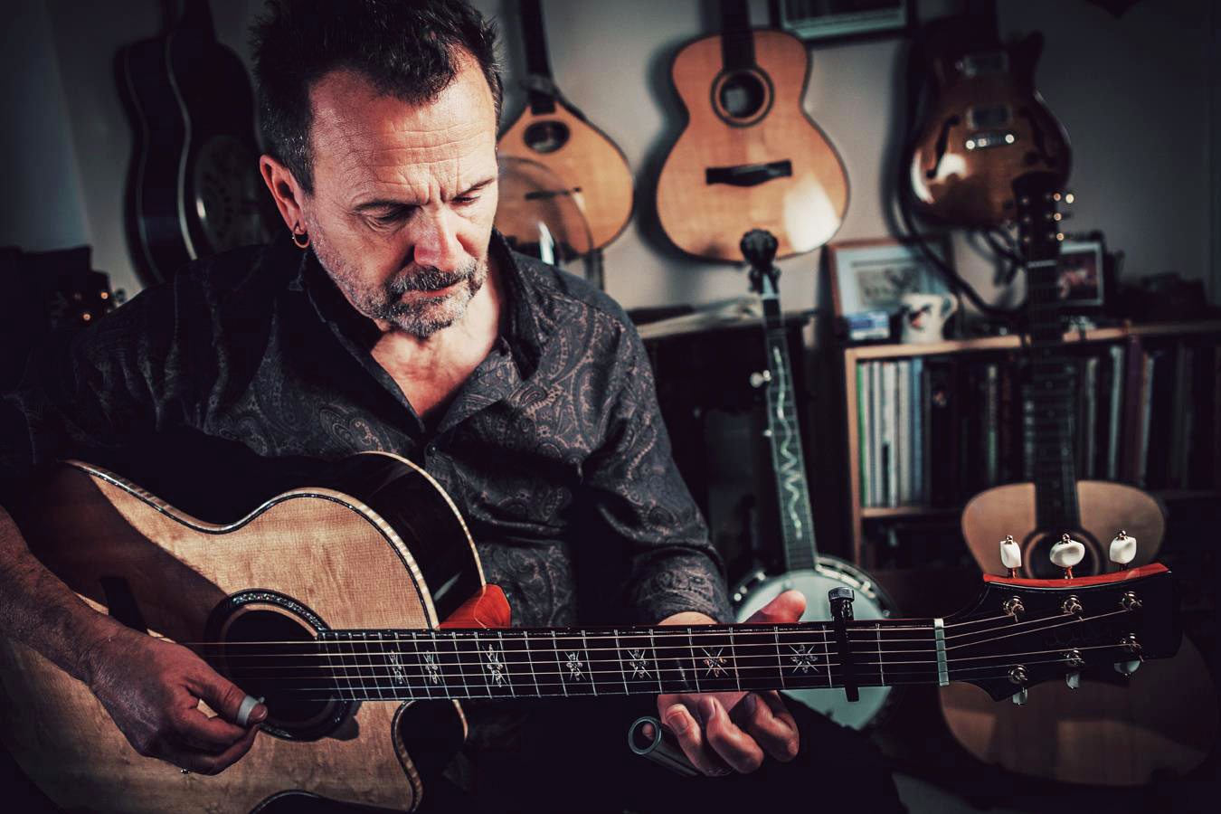 Richard uses a tungsten carbide Wolfram Martin Simpson Signature Slide and Wolfram Precision : Crystal nail files.